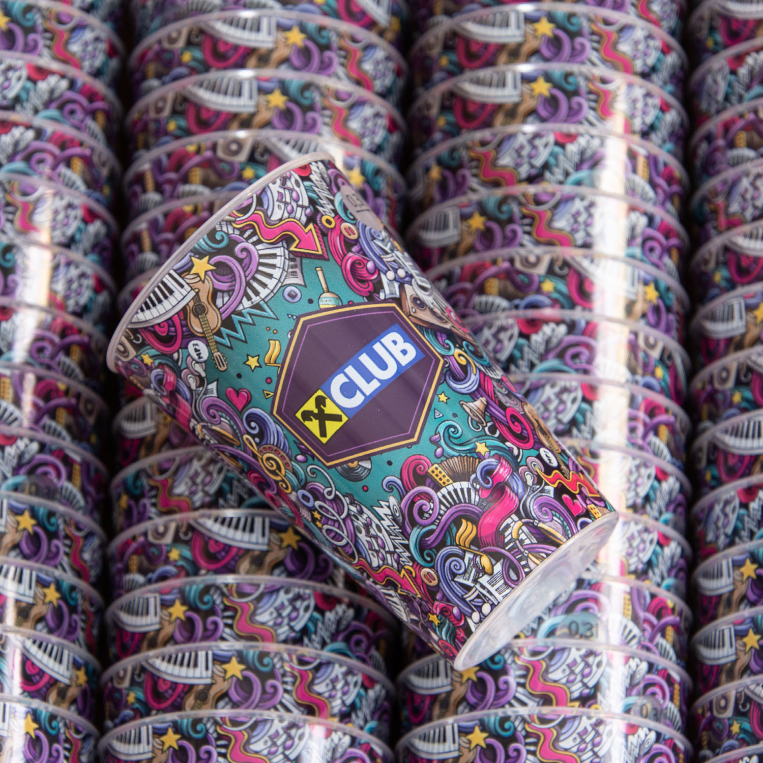 Unsere Mehrwegbecher sind im Digitaldirektdruck vollflächig bedruckbar. Sie eignen sich für Getränke mit einer Befülltemperatur von bis zu 70°C.